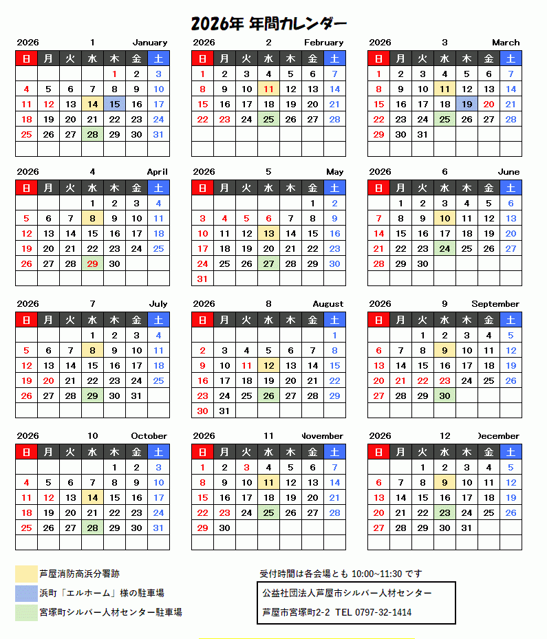 ①毎月 最終水曜日 場所:はつらつ館(シルバー人材センター横) 地図 ②毎月 第2水曜日 場所:高浜作業所前(旧消防署跡)高浜町7 地図 ③奇数月 第3木曜日(1,3月) 場所:エルホーム芦屋前 地図