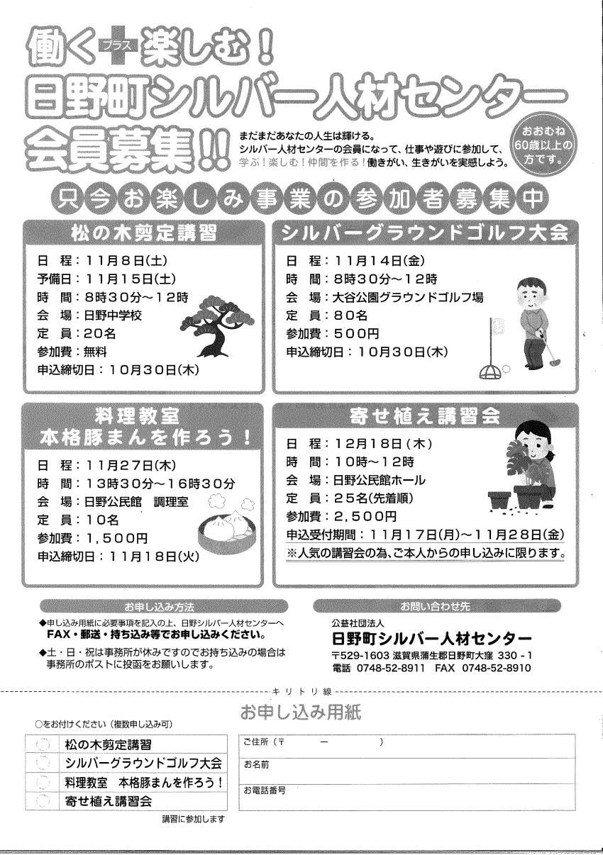 学ぶ・楽しむ・仲間を作る! 講習会・教室・スポーツ大会のご案内 ![]() 作業はしないで、趣味の講習会やスポーツ活動などには参加できる特別会員 「プラチナ会員」を募集しております。 年会費500円でお楽しみいただけます。 環境美化ボランティア活動 日野町を美しく! 公園や公共施設を美しくする環境美化作業を年1回行っています ![]() ![]() ![]() ![]() グラウンドゴルフ大会 寄せ植え講習会 ![]() ![]() ![]() 陶芸教室 ![]() ![]() ![]() ふじつる工芸 ![]() 筆ペンの講習会 ![]() ![]() 刈払機安全講習会 ![]() ![]() 剪定講習会 ![]() ![]() 「日野まちなか歴史散策と秋のさじき窓アート」 「日野ひなまつり紀行」などの町の観光イベントに シルバー人材センターは協力しています 「ちょっと一服休憩所」の運営 「人力車の車夫」 「ちびっ子集まれ企画」等 準備から後片付けまで協力しています。 ★ご参加ご希望の方はお声をかけえてください。 学ぶ!遊ぶ!活動も行っています。いつまでも仲間と楽しい人生を! |