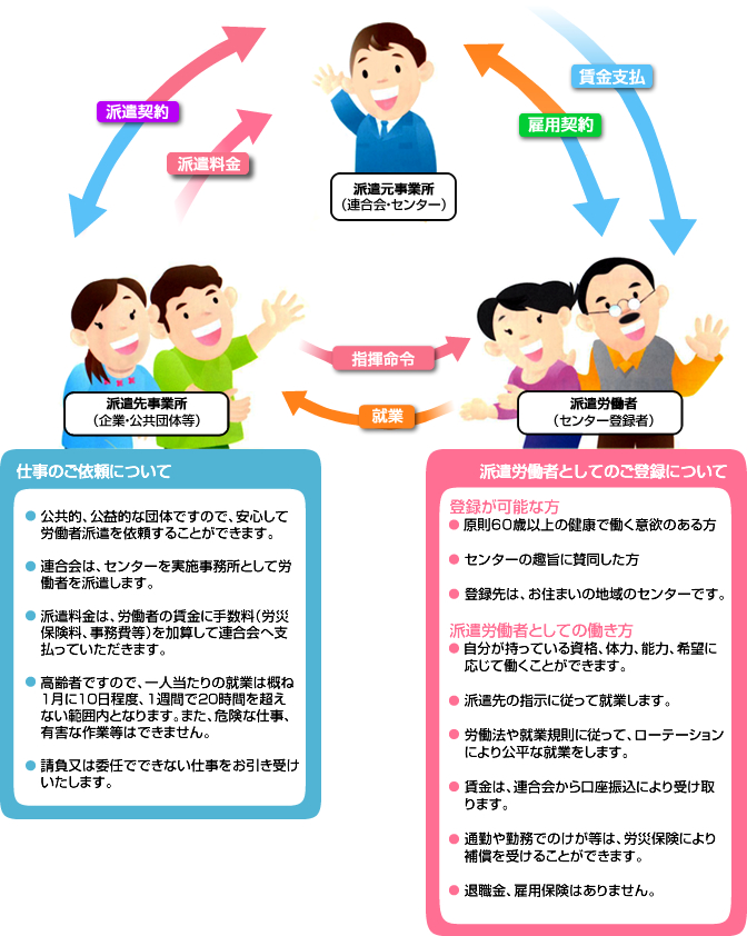 高齢者の採用に関心のある事業所の皆様は、お声をかけてください。労働関係法規(労働基準法、労災保険等)の適用を受けます。