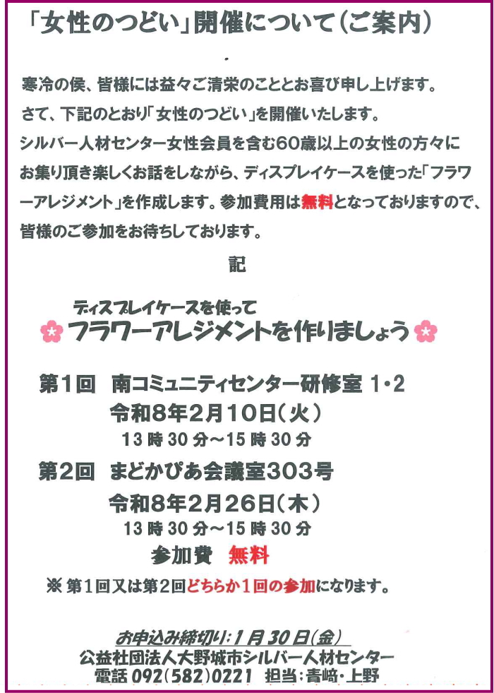 シルバー人材センター女性会員及び地域の女性高齢者の親睦と情報交換、連携、融和を目的とした『女性のつどい』を開催しました。