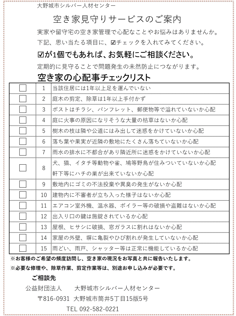 所有者様へご報告(写真付)する「空き家の見守りサービス」(1回2,000円/税込)を実施いたします。