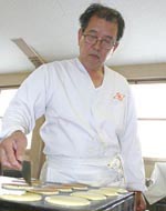 「なぜ、どら焼きって言うか分かりますか?それはね、出船時に鳴らされる銅鑼に似ているから…」とどら焼き談義に花を咲かせるのは、松江市シルバー人材センターの会員、青戸忠吉さん。青戸さんは、製菓材料の卸会社の営業職で培ってきたノウハウと人脈を生かし、平成十二年、センターの独自事業として菓子作り事業を立ち上げた。 事業は桜餅からスタートして、今はどら焼き一本。青戸さんが材料を仕入れ、元菓子職人の足立忠雄さんと松本正樹さんが皮を焼き、女性会員が餡をつめて完成。地域イベントでの販売と、毎月第4金曜日には、センターで会員を中心に販売。もっちりとした皮と、口の中にフワリと広がる餡の上品な甘味。銘菓店に匹敵する美味しさと、一個七十円という価格がうけて、評判も上々だ。 元菓子職人の足立さんは、和菓子、洋菓子と菓子全般を手掛けるプロ中のプロ。青戸さんに誘われてセンターに入会し、「どら焼き」や「そば打ち」など食に関する独自事業を共に盛り上げる。 昨年度はイベント参加が15回を超え、銘菓店に劣らない品をいかに無駄なく売り切るか全力を傾けてきた。といっても、数字に追われがちだった前職に比べ、のびのびと自分の技量を発揮できるから、面白くて仕方がないと二人は口をそろえる。 元々、お得意様と営業マンという関係だった二人。今は、その枠を越え、菓子の世界を知り尽くした者同士の厚い信頼関係が築かれている。「私達はどら焼きを通じたパートナー」と照れ臭そうに語る青戸さんの傍らで、足立さんの目が優しく微笑む。「次の目標はもっと手軽で、美味しい菓子をセンターから生み出すこと」と抱負を語る二人を、甘く香ばしいどら焼きの香りが包み込んでいた。 |